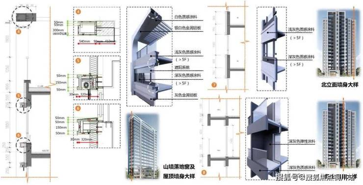 考虑到项目楼栋角度为南偏西37-39°,西晒及海面反射强烈,在立面设计之初就考虑了外遮阳系统,且遮阳系统的设计与立面元素做了巧妙融合,有效起到遮阳抗风、隔音隔热不隔景的作用,立面造型统一而不违和。