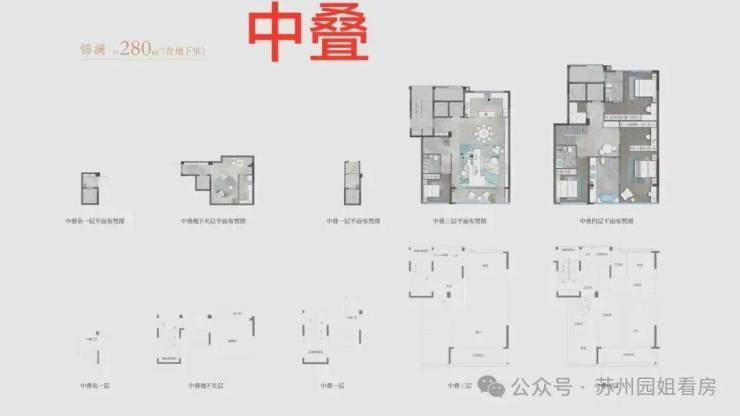 约280㎡中叠,带地下夹层储藏室,地上4房4卫,挑高赠送,上下双阳台开敞设计,得房率惊人!