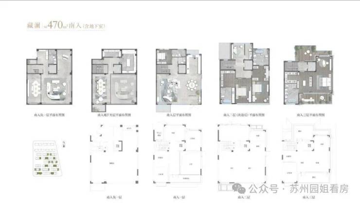 联排三款户型,建面约380㎡/470㎡/528㎡,均为地上三层设计,地下室地下挑高5.6米,可隔2层。