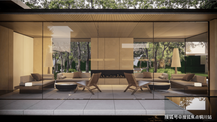 进入院落,中央景观主轴的焦点是苏州首屈一指的四季会客厅,罕见配置了中央空调与壁炉,营造出一个温馨而高雅的封闭式交流空间。