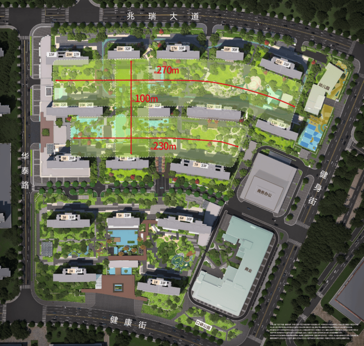 超100米南北向纵轴+约270米/约230米东西向双横轴,“两横一纵”工字形架构,营造超开阔、连续、无界的“豪宅”生活场域。