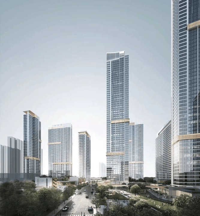 规划设计:风车状总图规划下,不同高度的楼宇呈交错布置,释放出城市楼宇间通透领域的同时,也构建出建筑群落丰富的天际线轮廓。