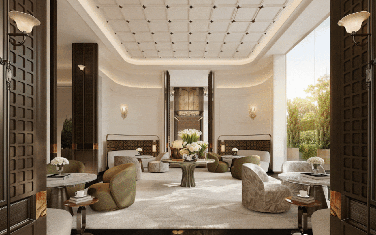 社区门庭上,纯古铜鎏金水波纹,由数十位非遗匠人以“双面錾刻”技法,历经数百天打磨而成。中央车站式大厅、社区尊奢会所、私宴厅、会客厅、行政酒廊与私属下沉庭院等豪宅标配一应俱全,营造“元萃雅集”的生活主场。