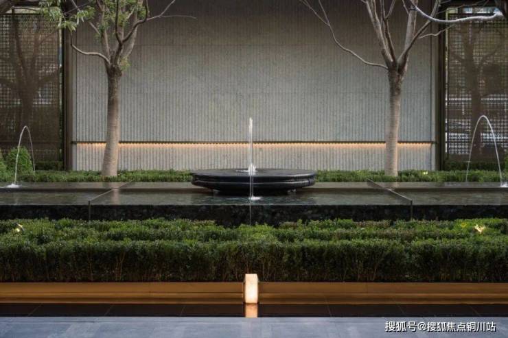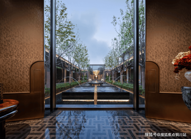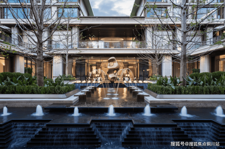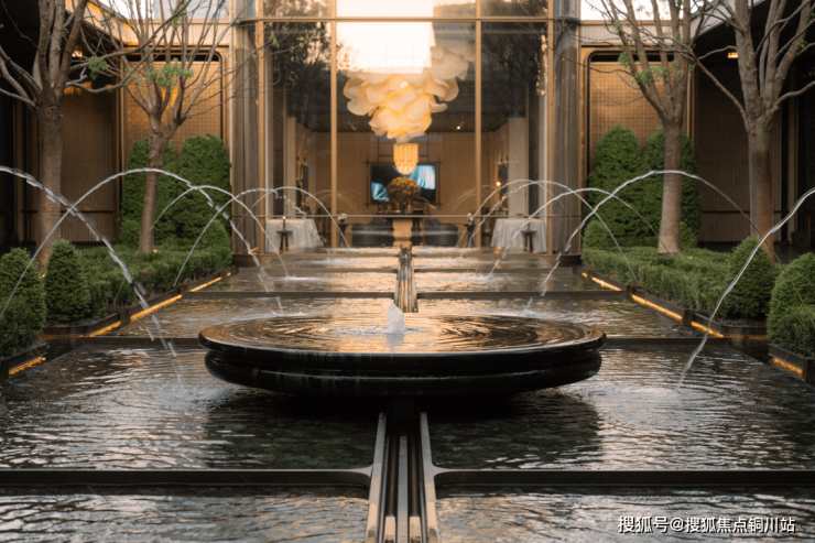 来到仪式水轴,眼前一块长20多米的蓝翡翠奢石水景,奢石如琉璃般晶莹剔透,两侧序列的涌泉演绎生动、优雅、精致的生活场景,给人一种静谧、典雅的空间氛围,彰显着酒店式奢华品质。