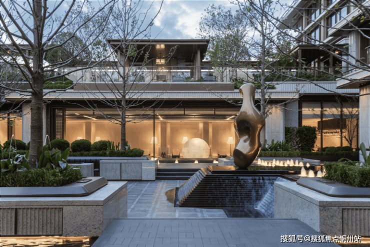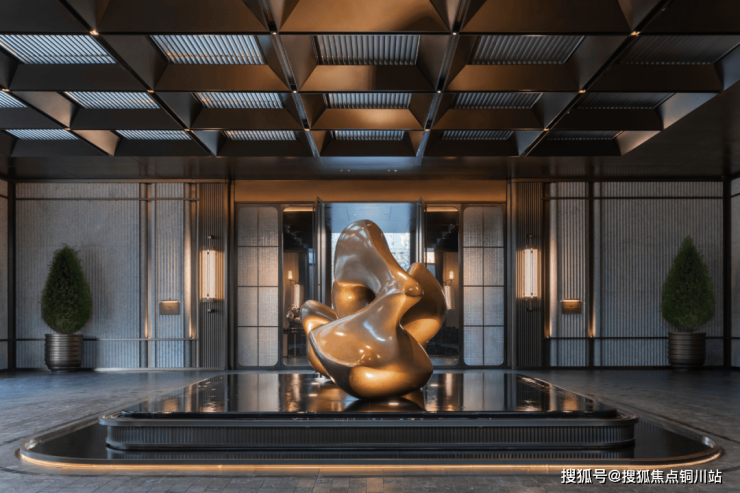 水景中央的雕塑是以东韵西境为基础,从亨利摩尔和太湖石二者中汲取灵感,进行创作而成。