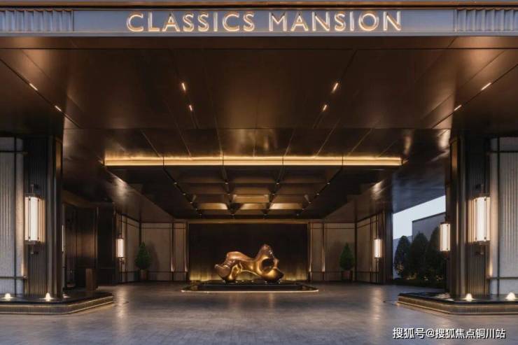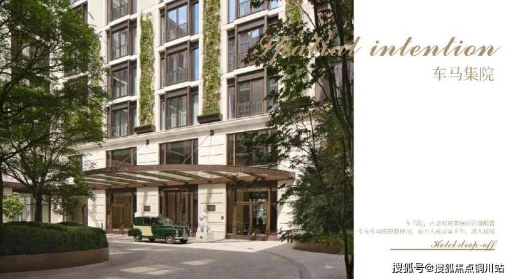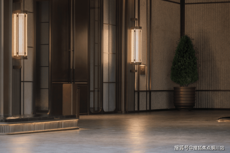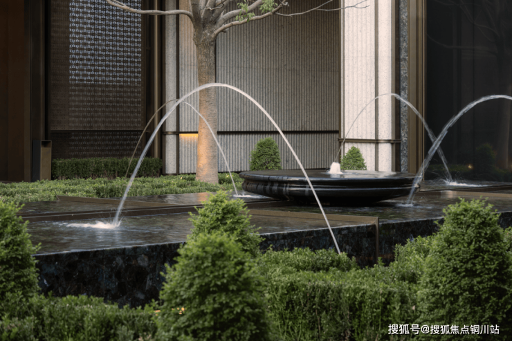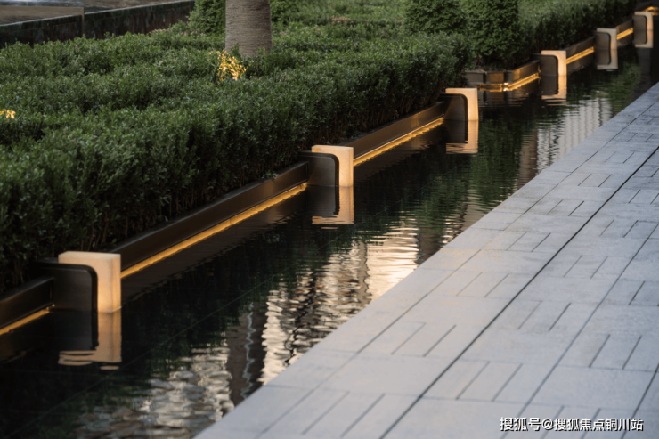 约6米高35米宽的奢华门头+舒适的42㎡车马院落客区,打造酒店式社区归家玄关。入口两侧的矮墙以及大门墙面采用海鸥丽晶酒店同款工艺的浅色波纹板石材,演绎经典地标与现代奢华的碰撞,尽显摩登和傲人。沿街两侧结合矮墙和绿篱设置L形镜面水景,打造业主形象尊贵的归家第一礼遇界面,彰显酒店式尊崇奢华品质。