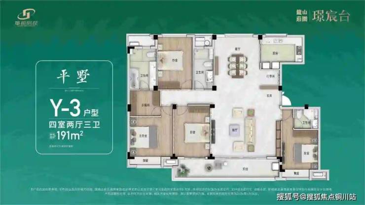 房间面积191平方米;四室两厅三卫,餐厅、客厅、阳台连通,打造南北通透的舒适效果!