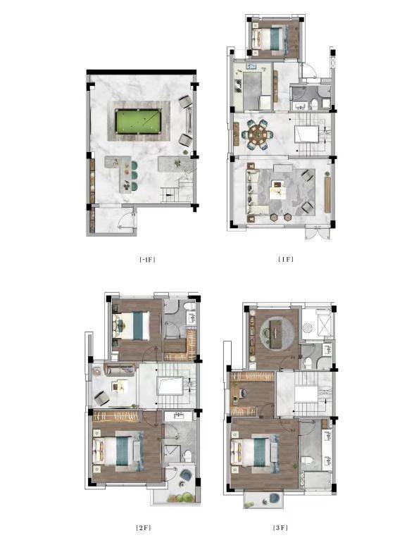 排屋:负一层 5.5 米挑高可改造夹层,形成五层空间;一层设老人房,二层双套房,三层主卧套房,满足三代同堂需求