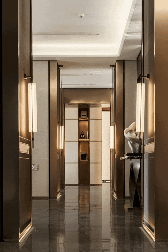 九庐特别邀请香港郑中CCD设计师团队操刀,以“艺术即生活”为内核,打造沉浸式美学体验。入户玄关大面积梵高棕奢石墙面与木饰面硬包碰撞,奠定隐奢基调,客厅至主卧通道的劳斯莱斯同款木饰面、主卧定制皮革床头背景墙等细节,彰显贵族气质。
