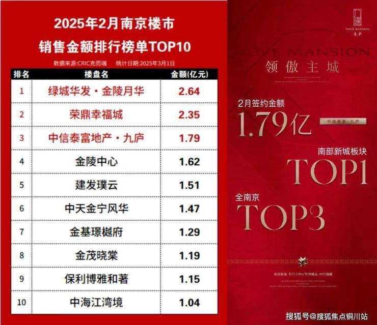 在克而瑞2月南京新房销售金额排行榜中,九庐则是以1.79亿元的签约金额位列南部新城TOP1,全南京TOP3!