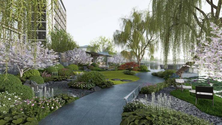 最巧妙的是社区的私密性和景观营造:绿城汲取苏州园林“迂回曲折”的空间精髓,结合地块特色设计“由巷入园”的隐逸动线,彰显苏州韵味;并通过场景的转换、景致的切换,从情绪感受上无限放大景观空间,形成层层递进、层次丰富的赏景效果。