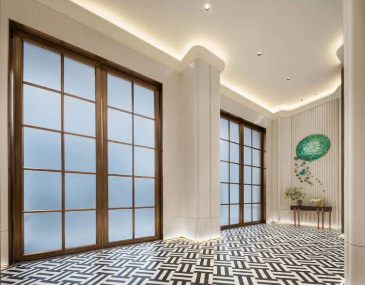 步入室内空间,5.5米挑高的入户大堂依稀有着上海百年地标——汇丰大楼与和平饭店的形与神,入户的双开铸铝装甲门上印有结合银杏叶与闽江水的水波纹。
