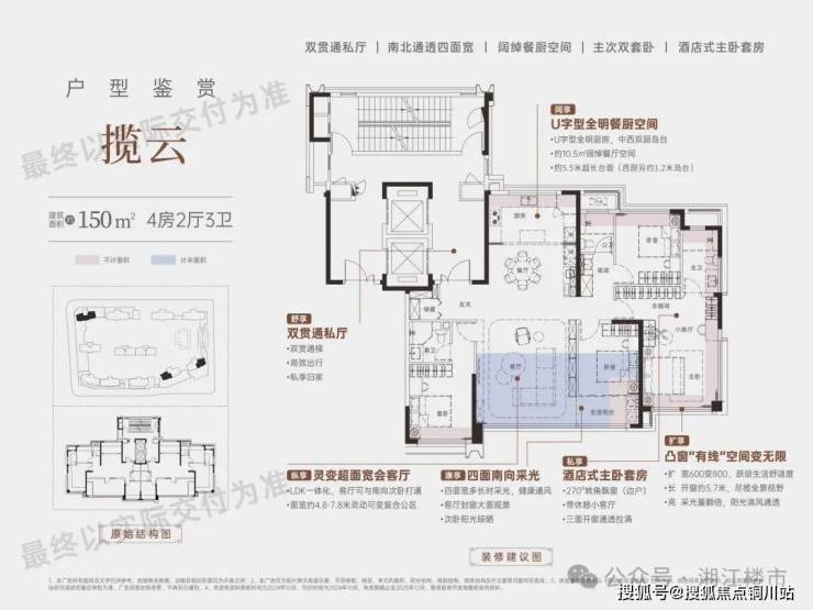 在户型设计上,建面约146 - 178㎡的改善产品,款款经典。146㎡四房两厅三卫,南北通透双阳台;150㎡四房两厅三卫,独梯入户,超面宽可变公区;178㎡四 + 1房两厅三卫,洄游式中西双厨,多场景社交厅。每一个户型都注重空间的实用性与舒适性,室内更少承重墙,毛坯空间改造性高,可随心定制生活天地。