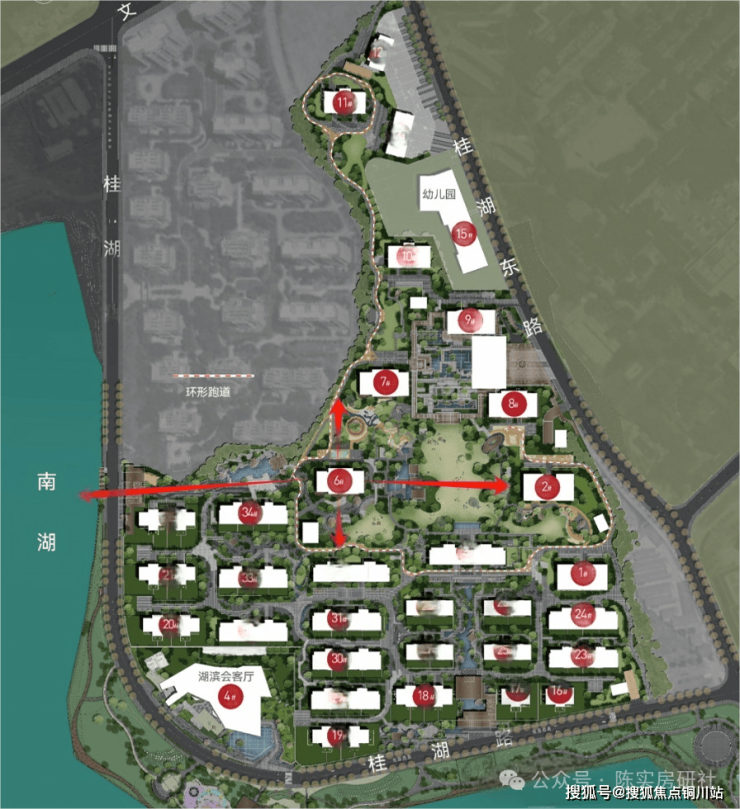 从地块来看,北面狭窄,南面比较方正。南面一线临湖以洋房为主,北面高层为主。而北面的1、3、5号楼为第一排高层,高层可以无遮挡看湖,湖景效果非常好。而6、7、10、11号楼可以西侧看南湖,8、9号楼相对看湖效果最弱。