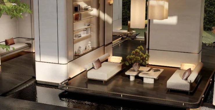景观配置的是湖西唯一下沉式庭院社区,以约950㎡中心水院为引,连风雨回廊、下沉会所庭院、游园步道、全龄悦享童趣花园、活力健身场地等,如休闲岛屿般一个个写意式延伸而出,让人漫步其中,无意间就收获如入山林的城市度假感。