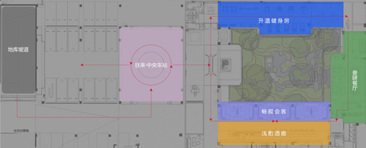 内部涵盖5大主题社交场景——往来·中央车站、浅酌酒廊、叁肆餐厅、升温健身房和畅叙会客厅,足以满足业主各种兴趣爱好、休闲娱乐、生活服务等功能,这也是区域首个垂直会所体系。
