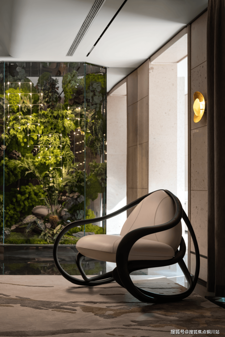 客厅以黑白为底,将江城山水化作空间的设计亮点。两处玻璃绿植屏风,层叠枝叶如一幅山水卷轴,将自然苍翠裁入一室。
