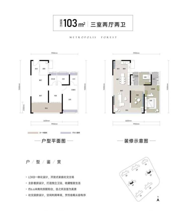 三开间朝南,南向面宽做到了9.9米,IMAX级视野无限延伸,空间全明通透,阳光洒满房间。