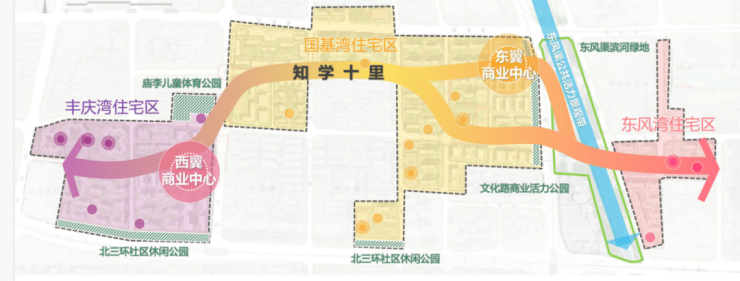 四公园:东风渠滨河绿地、北三环社区休闲公园、文化路商业活力公园、庙李儿童体育公园