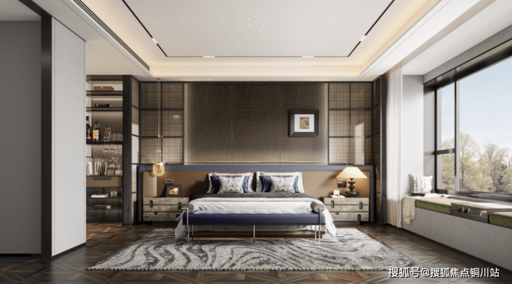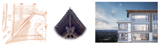 03 装饰构件化:在装饰细节上,金地·山川印深度挖掘传统斗拱元素的艺术精髓,对其进行抽象化创新设计,化身为极简线条与几何形态,巧妙镶嵌于建筑立面,既保留了古典韵味,又赋予其现代审美特质。