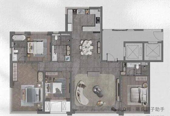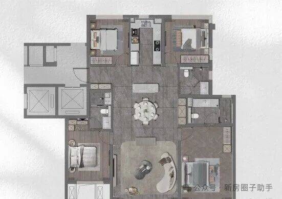 作为准四代,该户型优化后可比三代产品建面约200平以上的大平层。