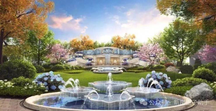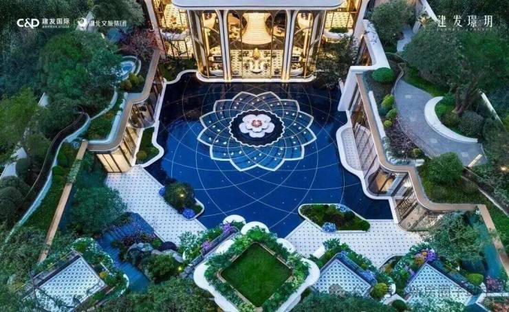 庭院上方的中庭达8000平(目前仅局部可见),包含超大琉璃露台、草坪空间和流水叠瀑,同样组成了一幅只有古典名画中的场景。据悉,从前庭到中庭,延伸出的园林中轴对景长约近百米。各楼栋每一套房子的窗前,都能无遮挡欣赏到这条风景线。