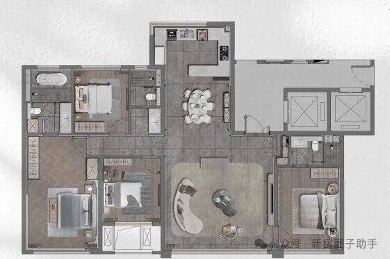 建面约153-155平四房,也位于3号楼,南北通透,三开间朝南,采用了独特的“四叶草”空间布局。四间卧室互不干扰,包含两个套房,搭配三卫配置,功能性明显提升。客餐厅一体设计,餐厅可放大圆桌。整体设计明显适配大户家庭所需。