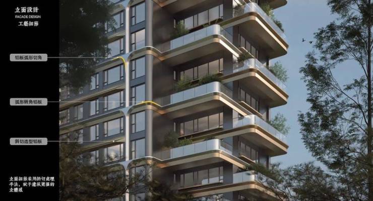 住宅外立面采用凤鸟纹、重檐线条,采用弧线、铝板、蓝钻玻璃与塔冠造型,飘逸典雅。实景园林里,融合荆楚文化中的凤舞雕塑、编钟灯墙、武汉印象的木刻雕塑,让人记得起历史。