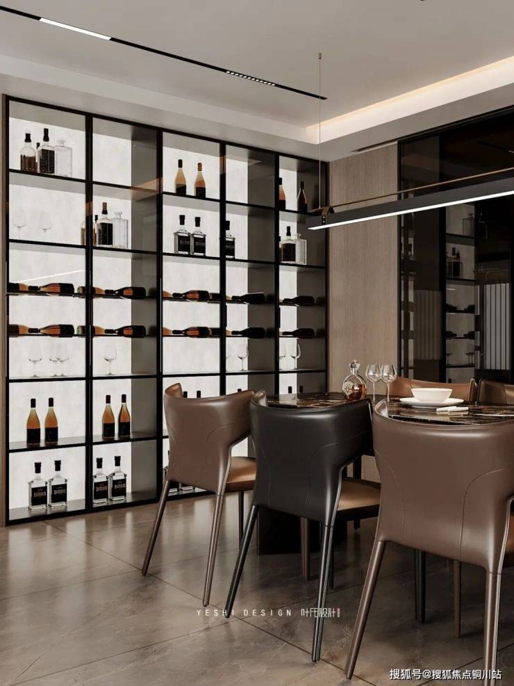 餐厅不仅设置了充足的储物空间,更增设了酒架与杯具收纳格,柜体线条笔直利落,拒绝任何多余的雕花或装饰,像静立于空间一隅的微型艺术馆,其设计完美遵循“藏露有度、光影为魂、材质对话”的核心法则,是主人品味与生活仪式感的沉默注脚。
