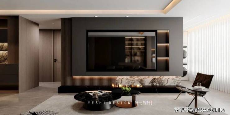 电视背景墙采用整面深灰色的哑光面板,勾勒出几何框线,结合了封闭式储物与开放式展示柜,用丰富的层次替代了复杂的造型,与下方壁炉里跳动的火焰为静态空间带来动态的呼吸感与丰富的层次,传递出深邃的温暖与宁谧的奢华。