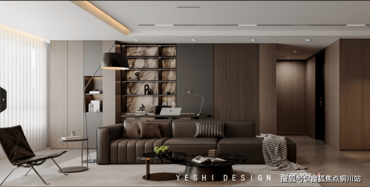 整个客厅空间以灰棕色阐述静谧沉稳的氛围,与微水泥地板共同为空间奠定静谧、包容且富有质感的氛围。深咖色的顶级皮具沙发,如同浓香的Espresso,为空间注入一丝醇厚、温暖与令人安心的包裹感,也成为客厅无可争议的视觉与体验中心。