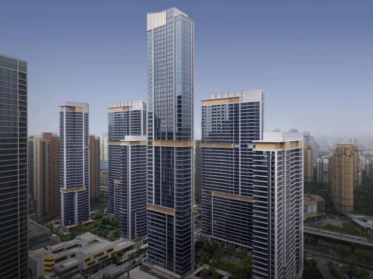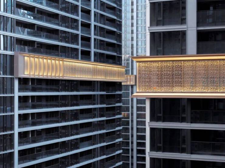立面设计汲取长江流动水韵的灵感,以风帆造型营造出极具辨识度的塔冠设计。定制的鎏金腰线既以「鎏光织锦」雕琢高定美学立面,更借起伏曲线暗合奔涌江潮之势——将长江「云奔潮涌、勇立潮头」的进取精神,凝练为武汉瑞府的城市精神图腾。