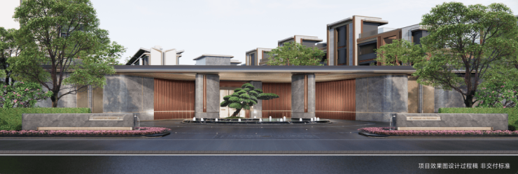 当然红线怎么退后都临主干道,这里樾云墅的解决方式是在门前造一座环岛水景,并配上了一棵百年树龄的罗汉松。