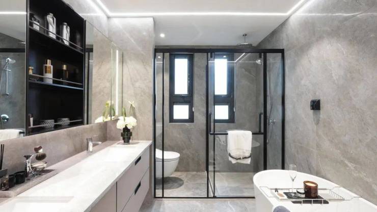 卫生间使用的也都是国际大牌,如高仪龙头和花洒,吉博力同层排水,主卫高配唯宝台盆和智能一体化马桶,还有美妆冰箱,体贴入微。另外,建面约142㎡主卫还有浴缸,你就说说还有谁,反正我是羡慕了!