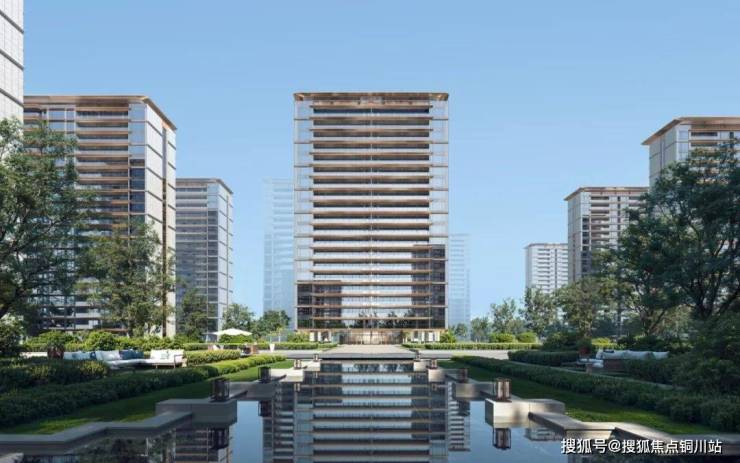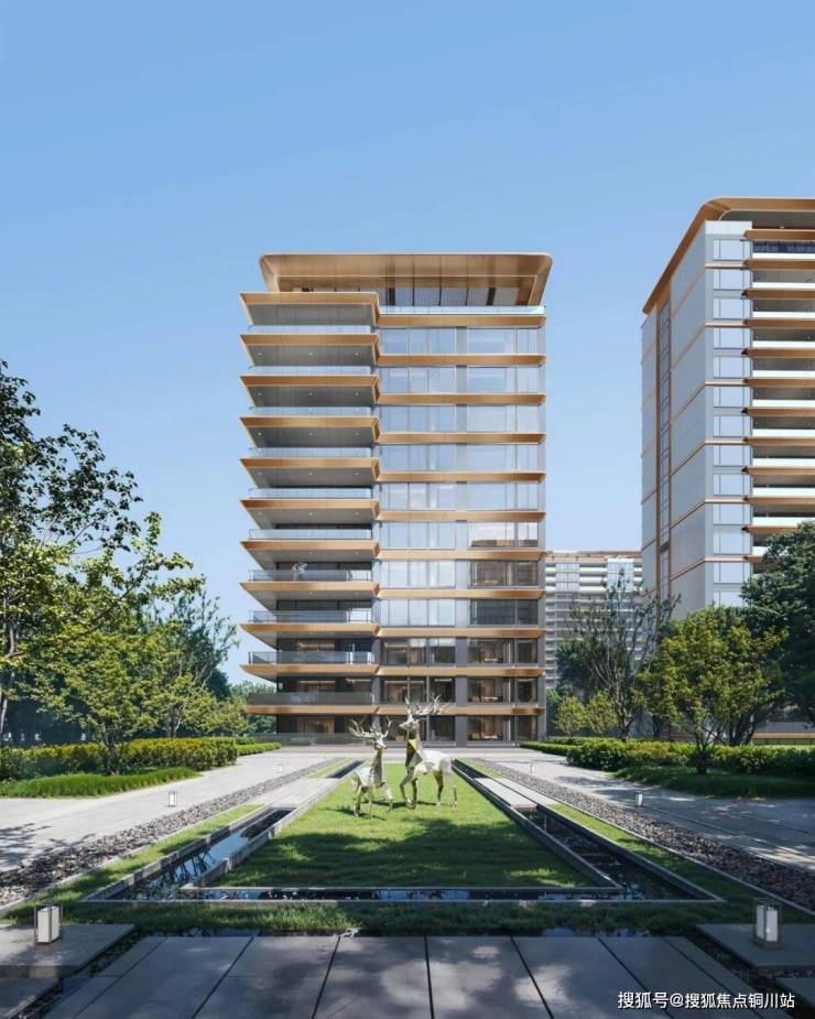 省府片区加上文化公园的气质是安静的,所以在立面处理上我们做的极为简洁,克制,水平的金属线条去展现“阔”的感受,不单是在视觉上同时也是指的生活哲学上。整体能给人一种静谧感,有一种处变不惊稳坐泰山的实力,立面设计以“金缕飞线”勾勒塔冠轮廓,体现一定的礼制韵味;公建化玻璃与古铜铝板的组合,则体现一种精致的低调奢华。