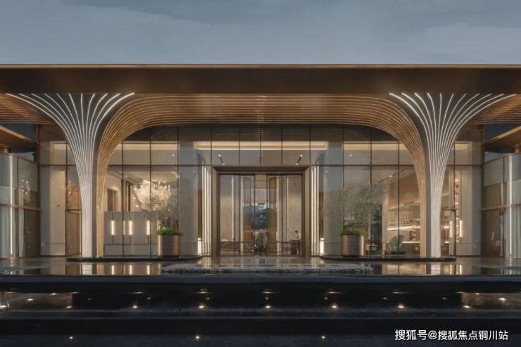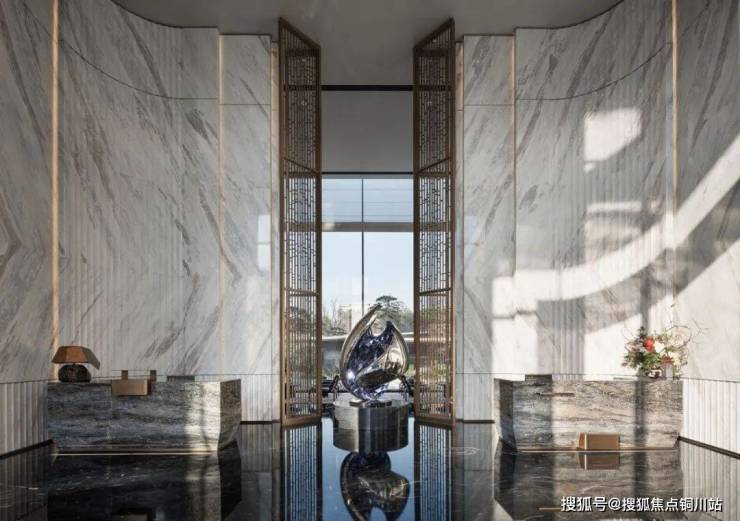 高净值人群对“隐奢、效率、艺术”的复合诉求越来越高,我们需要设计足够好的空间去将理想的生活场景逐步装载进未来的生活。首先展现圈层归属感的:酒店式归家门厅,9米高古铜森林大门,设计灵感源于第一次到文化公园里考察场地看到的自然的森林,我们用古铜不锈钢塑造了这座艺术之门,如树木般生机勃勃,不断发展向好的寓意。