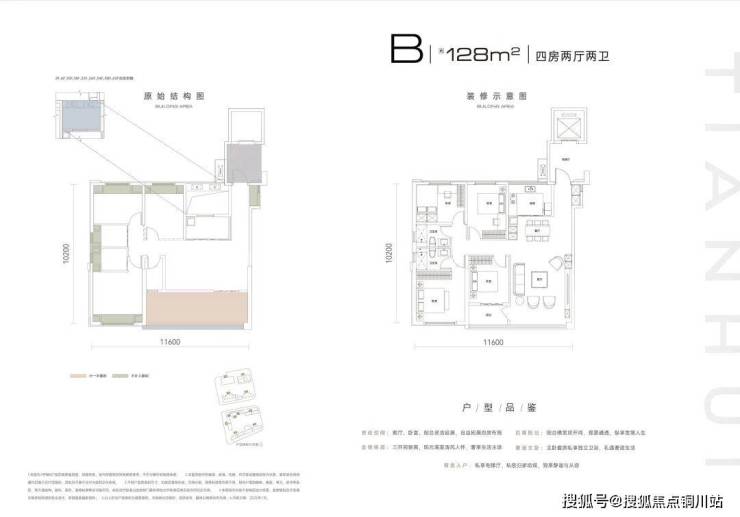 建面约128㎡,四房两厅两卫。