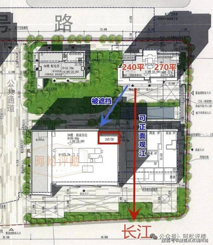 从规划看,这3栋住宅高层高区都有局部无遮挡的看江视野,在目前的二七滨江还是很稀缺的,2号楼在两栋商办之间,高区有不错的看江视野,低区也有一定看江视野。