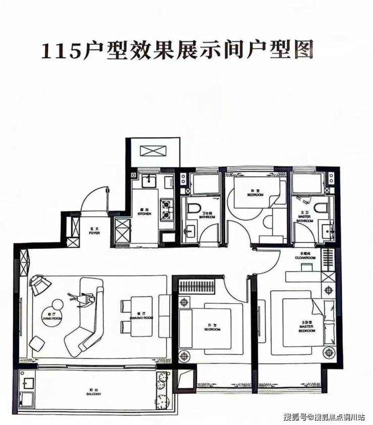建面约115㎡户型,同样是三房双卫设计,餐客厅一体化设计,形成约6m开间的大横厅,连通瞰景阳台。