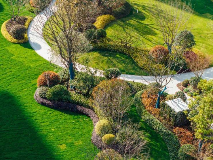 有别于传统项目一马平川的草坪设计,这处草坪采用了高尔夫球场的地形设计,我们可称之为园区版的“果岭”,通过处理土丘和坡度变化,创造出自然起伏的地形,提升整体的景观层次,看似“平平无奇”,实则蕴藏着景观工程团队的反复打磨和精工细作。
