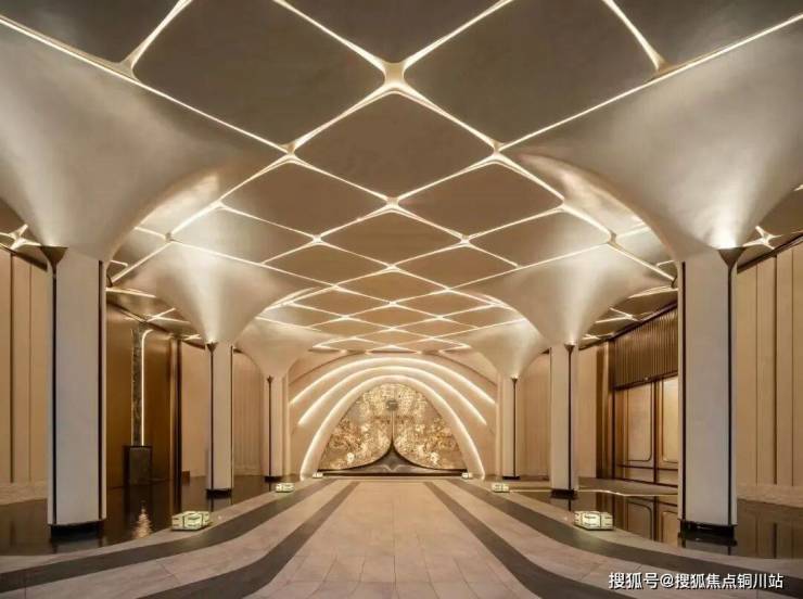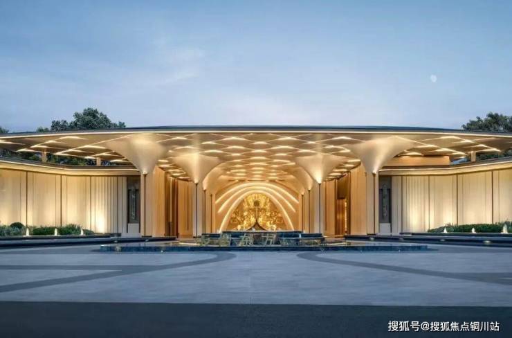 八方立柱撑起玉兰花瓣裂解穹顶。采用的是UHPC材料,卢浮宫同款,成本是普通石材的3倍,更是高级感的代名词。当你抬头,试图透过大门的穹顶寻找当晚的月色,你就浑然成为那个在满地六便士上抬头望月的人。