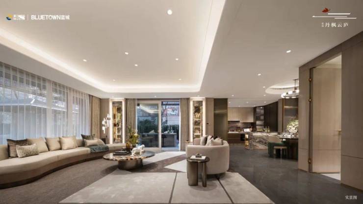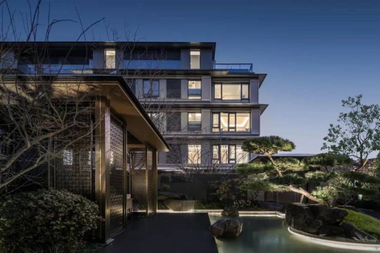 建筑风格:汲取宋式坡顶与挑檐,遵循现代高端镜面立面趋势,臻选高级铝板、石材勾勒建筑轮廓,搭配三玻两腔降噪隔音玻璃,超高窗墙比让室内与自然无界沟通。