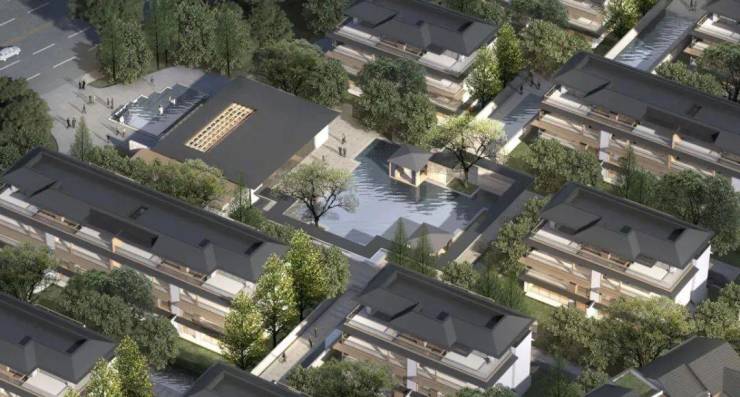 建筑设计:邀请国内顶尖的建筑设计公司 gad 建筑设计操刀,整体为粉墙黛瓦的中式江南水乡风格。提取了古镇传统建筑里木线条的元素,以及无锡古宅中的灰瓦白墙、木质门窗,转变成 “灰色、白色、木色” 三大主色调。同时,外立面使用了大面积玻璃,上叠设置了大面积露台,且上、下叠都带地下室,每户都带有独立电梯直通地下室。