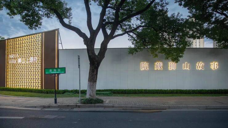 不同于以往简单的项目展示,新围挡以“院藏狮山+私藏合院”为核心主题,传递出低密社区的静谧感——浓荫掩映下的建筑轮廓、庭院里的光影细节,隐约透露出项目对生活场景的打磨思路,而非单纯强调建筑本身。
