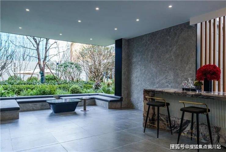 中庭采用大面积水景造型,仿佛让人进入了度假奢华酒店一般。全域连廊,衔接的是石材墙面与金属栅栏。