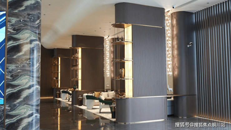 小区门口水景造型,用1800多片石材展现了叠山理水的理念,既有山水意境,又有流水生财的寓意。约12米高的入户大堂是武汉目前在售楼盘中难得一见的阔绰尺度。
