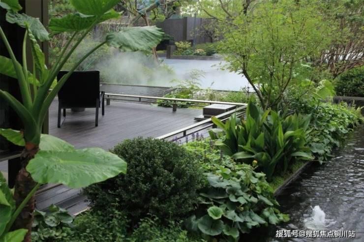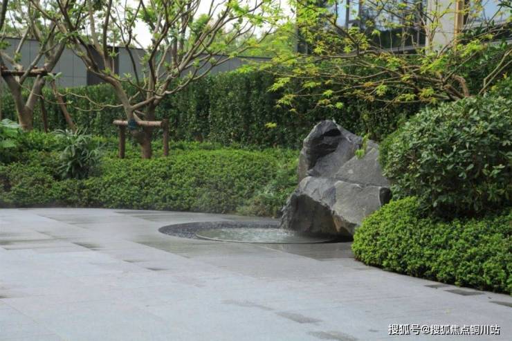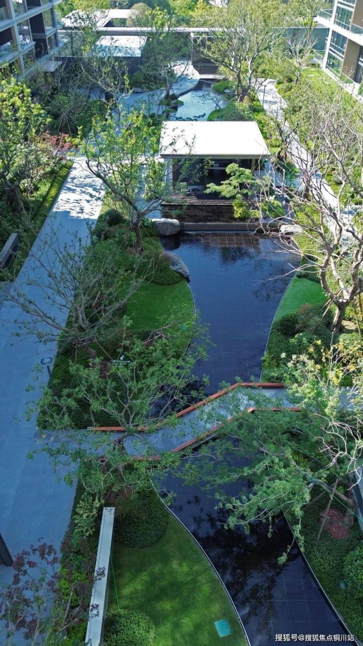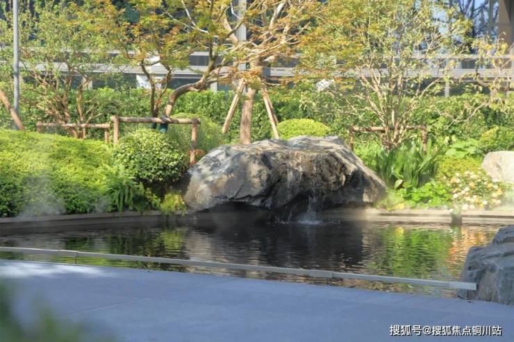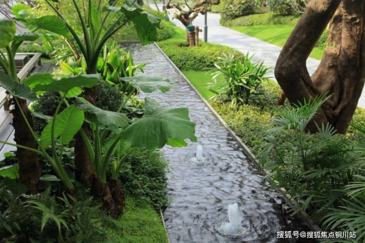 由动至静的流线型水景,住区入口为起点,一路顺流而下,形成一条贯穿整个林间的水景丝带,线条流畅自然,与周边场地道路、地形植被交错掩映。极简的镜面水景结合丰富绿植,潺潺跌水为溪流注入活力。池底为防止返碱采用胶泥薄贴,整体铺装完成后所有铺装缝为防止返碱积灰,采用黑色填缝剂进行填缝施工。