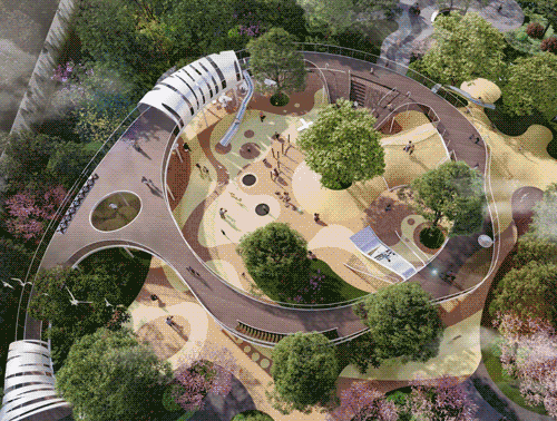 利用攀爬、滑梯等多种游乐方式串联上下两层空间,将覆盖全龄的活动功能巧妙的融合到云环中,形成一个与自然相互交融的综合活动空间。