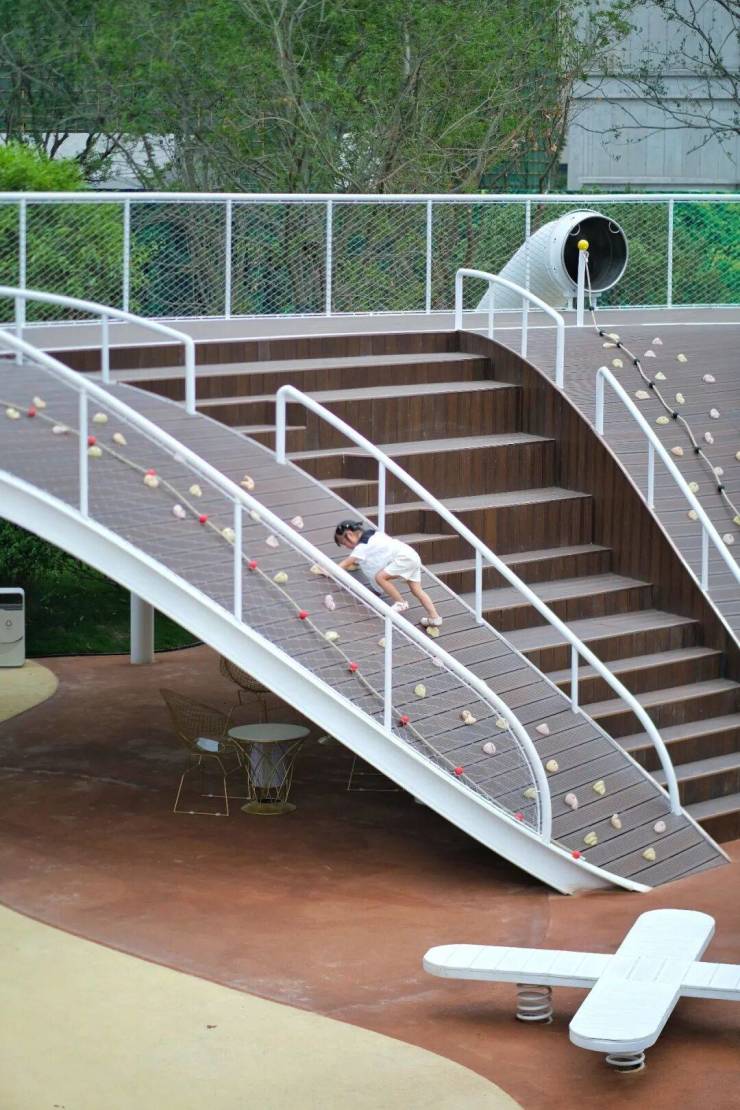 两侧的攀岩坡道,能够锻炼孩子们的勇气。成长就是不断攀爬向上的过程,累了停下歇歇也没关系,半路的风景也不错。