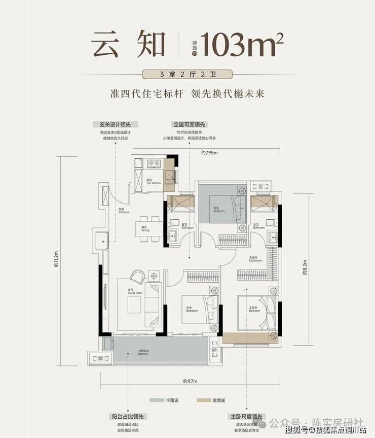 建面约103平 三房两厅两卫:连廊中间户,三开间朝南,北边对连廊,优化空间较多,南向大阳台,主卧独立卫浴和衣帽间,是常规中间户的格局。